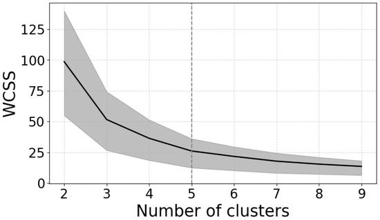 Optimal number of clusters suggested by the elbow method. This figure shows the WCSS for different numbers of clusters formed with the data. The mean and the quantiles are represented with solid line and shading, respectively.