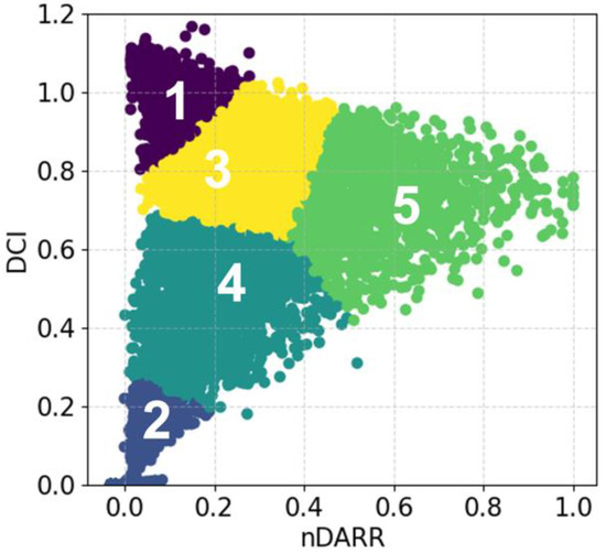 To propose a simple scheme, we plot an “arrowhead” diagram using DCI and nDARR. We use the clusters created by the k-means method (Figure 2) to identify the boundary and the centroids. The classification scheme is shown in Figure 3 and the DCI and nDARR values for each category are explained below: