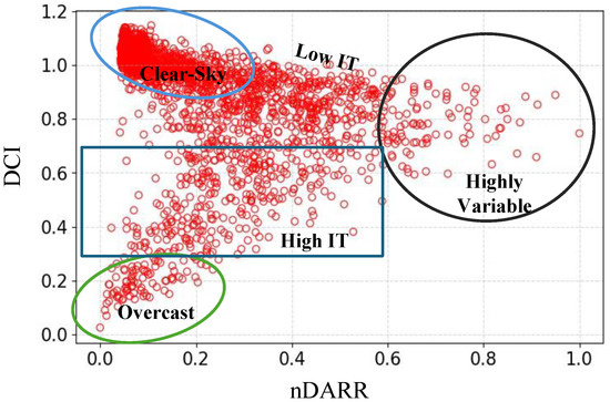 We propose a new sky classification scheme based on the DCI and normalized DARR (nDARR). The cloudiness at a location can be known by its DCI value. The DCI is close to one under clear-sky conditions and decreases with the decrease in daily radiation. On an overcast day, the DCI value is close to 0. The DCI can be estimated according to the following equation [12]: