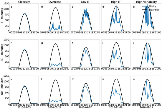 GHI profiles for Alice Spring plotted using data recorded at 5 min (a–e), 30 min (f–j), and 60 min (k–o) interval. Panel (a,f,k) represent clear day (5 May 2010). Panel (b,g,l) represent overcast day (24 February 2010). Low intermittent days are plotted in panels (c,h,m) (7 April 2010). High intermittent days and highly variable days are plotted in panels (d,i,n) (6 December 2015) and (e,j,o) (11 February 2010), respectively.