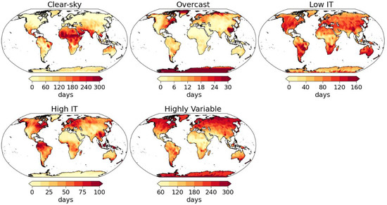 Frequency of clear, overcast, low intermittent, high intermittent, and highly variable days globally for the year 2022 obtained using the proposed classification scheme. This figure is obtained using ERA5 reanalysis dataset.