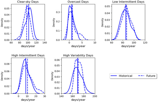 Density distribution plots of number of clear-sky, overcast, high intermittent, low intermittent, and highly variable days for Powell Creek solar farm located in Northern Territory, Australia for historical (1976–2005) and future (2030–2059) periods. The distribution for the historical period is shown in bold line. The future scenario used here corresponds to high-emission RCP8.5 future scenario and is shown by the dashed line. The vertical lines indicate the mean for that period.