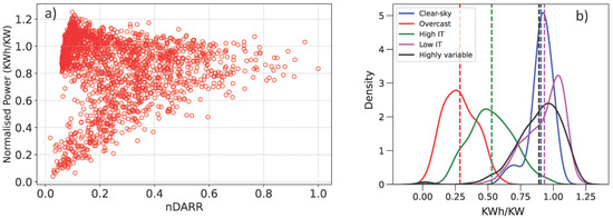 (a) Arrowhead plot for power output and nDARR. (b) Density distribution plots of system generation on clear-sky, overcast, high intermittent, low intermittent, and highly variable days for a PV system located in Desert Knowledge Australia Solar Centre, Alice Spring. The dashed lines indicate the mean generation of the system for each of the five categories.