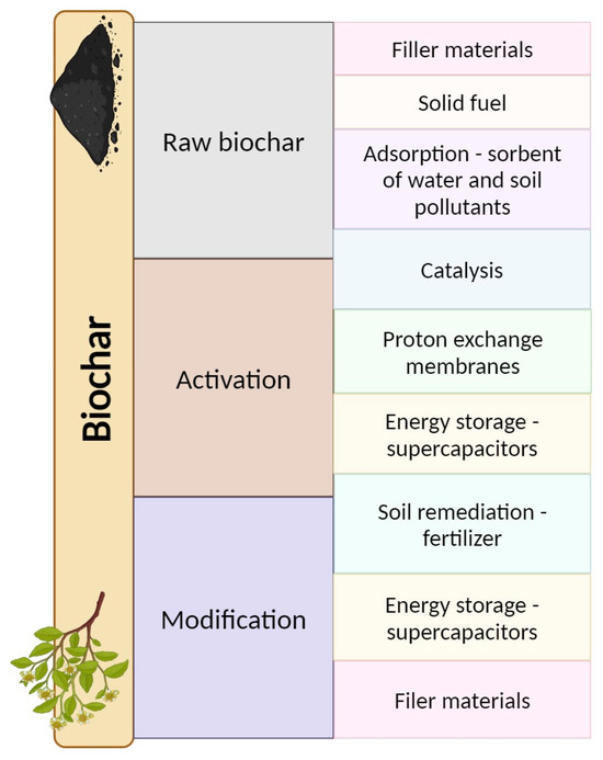 Biochar materials are successfully used in the energy and metallurgical (iron and steel) sectors as a highly efficient fuel, with low emissions of harmful substances into the atmosphere [40]. Biochar can also be used as a valuable fertilizer to improve soil structure by changing the physicochemical properties of the soil and can affect the reduction of nitrogen emissions into the atmosphere, thereby improving its utilization by plants [41,42,43]. Its physical and chemical properties make it a great alternative as a solid fuel in opposition to conventional fuels, and it also has potential as a sorbent for water and soil contaminants. Another advantage is that it is possible to obtain substrates for its production from various types of organic waste [44,45]. Biochar used in agriculture can not only reduce the negative impact of pesticides but also increase crop yields and improve the soil by creating favorable conditions for soil life [46]. Apart from agriculture, researchers are also looking for the use of biochar in construction, e.g., as an addition to asphalt and various types of binders to increase durability [47,48]. Biochar is also used in all kinds of filters for purifying and retaining heavy metals in air and water [31,49]. More application sites for pure, activated, and modified biochar are presented in Figure 1.