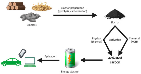 The dynamic development of the economic and industrial sectors, as well as the development of civilization, which coincides with the era of consumerism in which we live, comes down to increased consumption of electricity and heat. This is associated with ever-increasing demand, which the energy sector must meet [1]. As conventional fuels are being depleted, and with ever newer standards and regulations for reducing emissions of carbon dioxide and other dangerous oxides, along with legislation regulating their acquisition, other sources of energy are being sought to diversify domestic and global energy production, to improve energy security, and to reduce emissions of pollutants [2,3]. Renewable sources of energy from wind, solar, and water, unfortunately, have a huge disadvantage, which is instability in their supply of energy. This is caused by many factors related to the specifics of the renewable resource; for example, energy from the photovoltaic process is limited according to the time of day and year and degree of cloud cover, so energy is not produced continuously. Similar problems occur at wind power stations, where production depends on the strength of the wind [4,5,6]. In the case of hydropower, only one type of power plant, specifically pumped-storage power stations, has the ability to produce energy in a relatively stable and continuous manner, by creating storage in case of a lack of flow. This storage is in the form of a water reservoir, called an upper reservoir, in which the collected water represents the potential energy which, when released, turns into kinetic energy that drives the power plant. This is one of the few effective and efficient ways to store energy [7]. This is forcing the community to research the development of new ways to store electricity that would reduce the costs associated with its transmission. Modern energy storage facilities would also allow for the maximum potential of currently installed renewable energy sources to be used. A promising technological solution may be the use of storage devices such as, for example, supercapacitors, fuel cells, and lithium batteries [8,9]. This is thanks to their properties, such as high power and energy density [10]. In recent years, there has been a growing demand for their production and research to develop this energy storage technology [11]. Despite the wide range of applications in power generation and industry, ultracapacitors are not used because of their price. It is worth noting that the main cost during production is the cost of the membrane, accounting for up to 60% of production costs, and the cost of producing the cathode, accounting for about 38% of production overheads [11]. These costs can be minimized by using alternative materials, such as biochar from agricultural crops or plant or animal waste. Biochar, after additional refinement processes, improves its conductive properties and has a hierarchical pore structure, making it a material for possible use in supercapacitors [12].