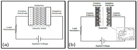 Diagram showing the operation of a traditional capacitor (a) and a supercapacitor (b) [104].