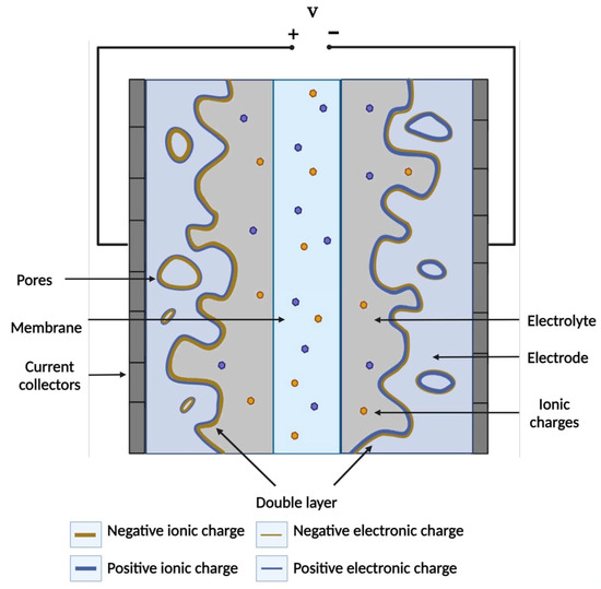 For the production of supercapacitors, electrodes and electrolytes created from different materials are used; this affects the ways in which energy is stored in them. The building blocks of a supercapacitor are two mostly porous electrodes that act as an anode and cathode, electrolyte, and separator [106] (Figure 5). The entire operation of such a supercapacitor is based on its charging and discharging. During charging, electrons travel from the negative electrode to the positive one, causing cations to accumulate from the electrolyte as close to the negative electrode as possible, and anions to accumulate on the positive electrode, thus forming an electrical double layer, or initiating Faradaic redox reactions to compensate when the charges are out of balance. On discharge, electrons travel in the opposite direction, causing ion mixing or reverse redox reactions [103,106].