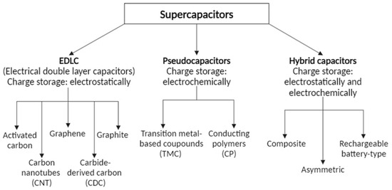 Depending on the materials used, the mechanism of energy storage changes, so there are three main types of supercapacitors, and these include: electrical double-layer supercapacitors (EDLCs), pseudocapacitors, and also hybrid supercapacitors (Figure 6).