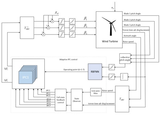 Therefore, in order to improve the robustness and stability of the system, an adaptive control strategy is adopted, which uses several parallel control loops, but only one control loop is connected to the output [24]. The multi-objective control to reduce the rotor speed fluctuation, tower load, and blade load is considered comprehensively. This paper develops an independent pitch adaptive control strategy based on full-state feedback (FSFB) and DAC on the basis of the above research, adopts the DAC to eliminate the dynamic effect of wind disturbance on the system and designs a set of IPC controllers, selects RBFNN for scheduling gain parameter adjustment, and the combination of the output values and controllers are switched to different operating points, which ensures the performance of the pitch system and the robustness between the appropriate trade-off between performance and robustness of the pitch system. The NREL 5MW wind turbine is simulated by FAST and Simulink and compared with the ROSCO controller and DAC controller under different wind conditions, and the simulation results show that the control strategy proposed in this paper can ensure the stability of the output power of the wind turbine, and can further reduce the fluctuation of the rotor speed, and the structural loads of the tower and blades.