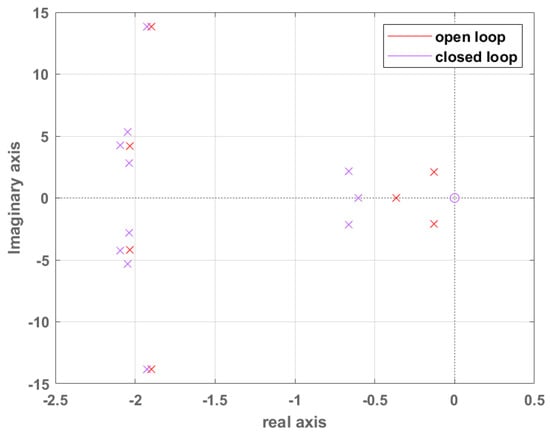 To implement a full-state feedback controller for a wind turbine, all states included in the full-state feedback control law (12) must be accurately measured. Achieving this in practical applications is challenging. Therefore, a state observer is designed to replicate the functionality of the full-state feedback controller. A detailed description of the observer design is provided in Section 3.2. The pole positions of the closed-loop system states were selected as −0.6, −0.67 ± 2.13i, −1.92 ± 13.86i, −2.04 ± 2.79i, −2.05 ± 5.32i, −2.09 ± 4.25i. The poles of the state estimator are selected to be positioned further to the left in the complex plane than those of the states being estimated. Following LQR control optimization, the resulting controller gain is a 3 × 11 matrix. The closed-loop pole positions estimated by the system are −0.15, −1.54 ± 2.39i, −1.86 ± 13.84, −1.94 ± 4.27i, −2.04 ± 2.81i, and −2.05 ± 5.32i.