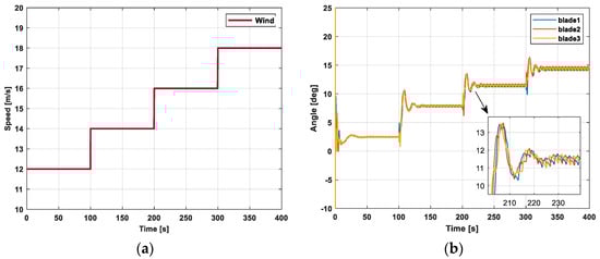 Step wind response. (a) Hub height wind speed. (b) Blade pitch angles.