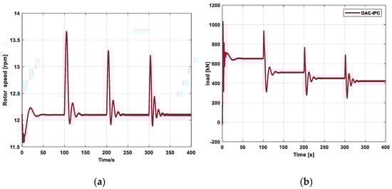 To assess the closed-loop control performance of the DAC-IPC at varying operating points, the step wind profile depicted in Figure 4 is utilized. The hub height wind speed ranges from 12 m/s to 18 m/s. The step size is 2 m/s, and the simulation time is 400 s.