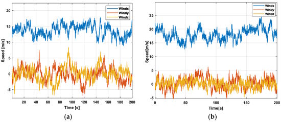 Turbulent wind. (a) mean wind speed—14 m/s. (b) mean wind speed—18 m/s.