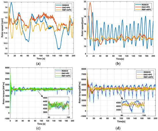 Speed/Torque regulation response. (a) Rotor speed (14 m/s wind). (b) Rotor speed (18 m/s wind). (c) Rotor torque (14 m/s wind). (d) Rotor torque (18 m/s wind).