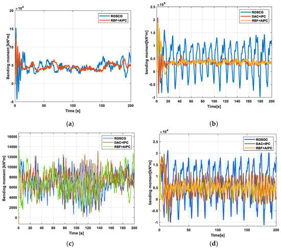 Structural loading in blade and tower. (a) Tower F-A bending moment. (b) Tower F-A bending moment. (c) Bladed F-W bending moment (14 m/s wind). (d) Bladed F-W bending moment (18 m/s wind).