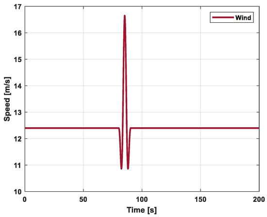 The extreme operating gust generated using IECWind, simulation time 200 s, and simulation time 85 s encountered a sudden increase in extreme wind speed. As shown in Figure 9.