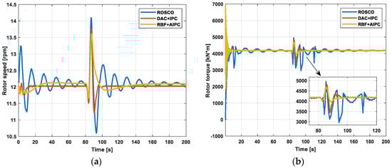 Figure 10 shows the variations in rotor speed and torque over time under extreme wind conditions. Statistical analysis reveals that the standard deviation of rotor speed is reduced by 44.9% and 24.44%, and the standard deviation of rotor torque is reduced by 49.57% and 11.53% with the proposed controller compared to the ROSCO and DAC + IPC controllers, respectively. The ROSCO controller exhibits larger overshoots and slower dynamic response, while the DAC + IPC controller demonstrates better dynamic performance but is associated with more pronounced steady-state errors. Although the RBF + AIPC controller also experiences some steady-state error, its dynamic response is faster than that of the DAC + IPC controller. More detailed comparison parameters with different controllers are given in Table 5.