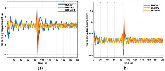 These results indicate that the proposed controller offers superior adaptive and anti-interference capabilities, effectively maintaining stable generator operation. Figure 11 shows the internal and external bending displacement of the blade tip surface. As shown in Figure 11a, there is no significant difference in the maximum values of the internal and external bending displacements of the blade tip surface across the three controllers. However, Figure 11b indicates that the fluctuation in the maximum value of the external displacement is more pronounced. Compared to the ROSCO controller, the standard deviation of the external bending displacement of the blade tip surface is reduced by 31.8%. This reduction effectively mitigates wind perturbations and alleviates fluctuations in both the blades and the associated loads. Table 6 provides the standard deviations of both in-plane and out-of-plane displacements at the tip of the blade for each controller.