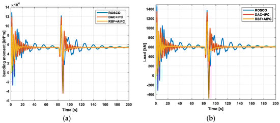 Figure 7 illustrates the variation in rotor speed and torque over time at different wind speeds. When compared to the ROSCO and DAC + IPC controllers at an average wind speed of 14 m/s, the proposed controller effectively regulates the rotor speed to 12.1 r/min and reduces rotor torque fluctuations. Stable operation of the generator is maintained. Quantitative analysis reveals that at 92.2 s, the rotor speed under ROSCO control is 13.08 m/s, whereas under RBF + AIPC control, it is 12.37 m/s, representing a 5.43% reduction. The rotor speed under DAC + IPC control is 13.25 m/s, which is slightly higher than that under ROSCO control. This is attributed to the greater trade-off required between load reduction and speed regulation for the DAC + IPC controller. From Figure 7c, it can be seen that the RBF + AIPC controller has a similar torque control performance to the other controllers with no significant performance degradation or fluctuation. However, at a wind speed of 18 m/s, the rotor speed fluctuates significantly, and the torque exhibits periodic variations. The ROSCO controller’s performance appears inferior compared to the DAC + IPC and RBF + AIPC controllers, which are both effective in reducing rotor and torque fluctuations. Specifically, the average rotor speed is reduced by 7.27% and 10.24%, respectively, under DAC + IPC and RBF + AIPC control. The average torque value was reduced by 1.31% and 2.36%, respectively, for DAC + IPC and RBF + AIPC controls.