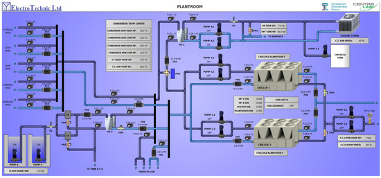 There is an installed server on which there is an Sql Server—a database where the measurements are stored. This is connected to a local network through which there is communication with the control device (HAWK Controller, Honeywell International Inc., Charlotte NC, USA). HAWK is the central device that provides the ability to interconnect and communicate between the various communication networks. It collects, edits and distributes information through the networks that have been created in the emergency management and emergency center. For connecting and communicating on individual devices, communication protocols and control applications such as ModBus, LON, BACnet, and SNMP are used. There is also a Client Computer for supervising the entire system with the Software System ARENA Nx, version v11, (Honeywell International Inc., Charlotte, NC, USA). Arena Nx is a platform that collects all the data, analyzes them and presents them in a user-friendly graphical environment. Through Arena Nx, the user can, in a daily framework, browse the various rooms of the building and is given the possibility to monitor the condition of a machine, change the state of a machine, change the definite operating points and set-points like temperature and humidity, collect historical data for various measurements, check for any bugs on any machine, and finally extract abstract and graphical representations for various data. The BMS also includes the following important features: (i) temperature sensors (Honeywell, KTF20-65-2M, Cable-type Bulb Temperature immersion sensors—Honeywell International Inc., Charlotte, NC, USA) that can be employed for systems with installations using hot and cold water, with temperatures ranging from −30 °C to +105 °C with accuracy of ±0.2 °C at 25 °C and (ii) water flow meters (Honeywell, EWA 110C-PO) with an accuracy of 1 L per pulse).