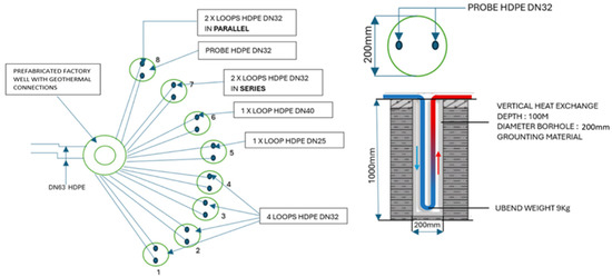 (a) Eight (8) vertical GHEs with a 100 m individual depth but different diameters and configurations, as shown in the sequel. Specifically, there is (i) one single vertical GHE with Ø25 mm polyethylene pipe, (ii) four single vertical GHEs with Ø32 mm, (iii) one single vertical GHE with Ø40 mm, (iv) one double vertical GHE with Ø32 mm connected in series, and (v) one double vertical GHE with Ø32 mm connected in parallel.