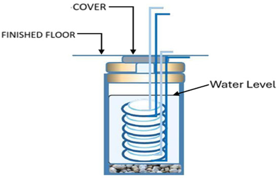 The spiral arrangement GHE is like traditional horizontal arrangements similarly positioned horizontally in shallow grooves, but their piping has a spiral pattern. At the end of each spiral, there is a straight pipe arrangement that transports the fluid to the HP [44]. These GHEs require less surface area than other horizontal configurations but require a longer length of piping [45]. Another variation of these systems is to position the spiral tubing vertically in narrow slots. These have the advantage of significantly reducing the necessary surface area, which contributes to the system’s cost. Because of their increased length and geometry, they require more pumping power to circulate the fluid, which reduces the installation’s efficiency [46]. A different configuration can also contain spiral GHEs immersed in water rather than in the ground. It is a spiral-shaped design that is slightly above the bottom and allows water to flow continuously around the piping [42]. The specific GHE of UMLL, as shown in Figure 4, consists of a double helical configuration in an open well of a 0.5 m and 0.8 m coil with 6 m height. The analytical cost of this double helical GHE is shown in Table 2.