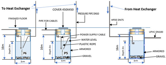 Finally, regarding the geothermal well design, the engineer must consider the purpose and objective of the well, the conditions likely to be encountered downhole during drilling, the identification of material and equipment required, and safe drilling procedures that will ensure successful well completion and, thereafter, a satisfactory design life of the well. Casing-depth selection, material weight, and connection specifications are all part of the design process [47]. The well GHE complex of UMLL, as shown in Figure 5, consists of two open armored water extraction wells and one armored water injection well, each 16 m deep and 1 m in diameter. Table 3 shows the analytical cost of the open-well GHE complex.