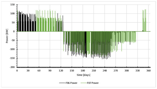 As seen in Figure 2, there are two chillers in the system that normally operate alternately every other day. In the event that any of the chillers is not functioning, it is replaced by the other chiller. Figure 6 shows the input power in the two chillers, recorded every 15 min throughout 2019. One can see that initially, Chiller 1 (F06—black) was in operation for about 2 months, followed by Chiller 2 (F07—green) for the next 2 months. After that period, the BMS was programmed so that the two chillers were operating on alternating days. The peak power values were at ~110 kW and ~150 kW for the winter and summer periods, respectively.