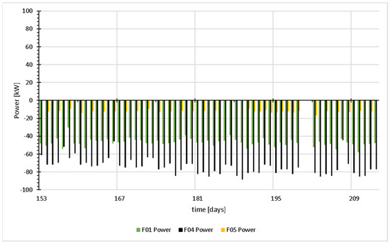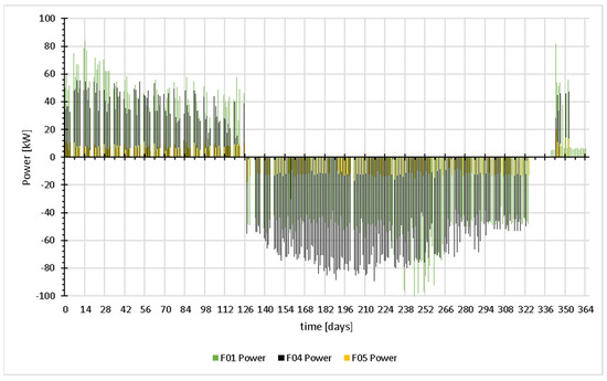 The input power to the chillers can be analyzed into the input of the three sources of contribution (Figure 7), that of the vertical GHEs (F01—green), the complex of the open wells (F04—black) and that of the helical coil (F05—yellow). As can be seen, the power for winter (summer) can vary for the boreholes for a maximum of about 85 kW (100 kW), for the system of the open well to a maximum of 55 kW (85 kW) and for helical coil to a maximum of 15 kW (15 kW).