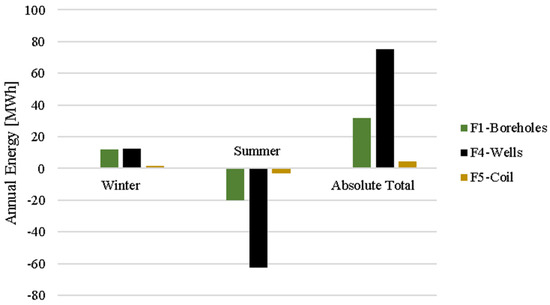 Finally, Figure 9 shows the annual (2019) energy in kWh, contributed by the three GHE groups (boreholes: F01—green color; wells: F04—black color; coil: F05—yellow color). It is clear that annually, the well complex offers the greatest amount of energy, with a total of 75,046 kWh (270,166 MJ). In summer, when the amount of energy required for the needs of the library’s cooling is far higher than in winter (typical of the Mediterranean weather of a coastal area in Cyprus), the superiority of the well complex is more evident.