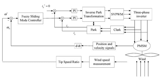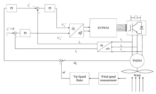 The structure of the maximum power tracking control system for the permanent magnet synchronous wind power generation system is depicted in Figure 1.
