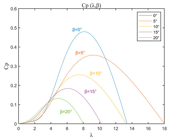 Equation (2) illustrates that the power coefficient is determined by both the tip-speed ratio and the pitch angle . As depicted in Figure 2, the power coefficient exhibits a nonlinear relationship with the TSR when the pitch angle is held constant. Each pitch angle is associated with an optimal TSR that maximizes the wind energy utilization coefficient. Notably, when the pitch angle , the system’s power coefficient reaches its peak value of 0.48, coinciding with an optimal TSR of 8.1. Thus, by adjusting the TSR, the wind energy utilization coefficient can be maximized, consequently achieving the objective of MPPT.