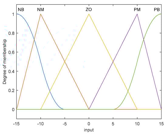 In the process of fuzzification, precise data must first be mapped to fuzzy quantities through the establishment of appropriate fuzzy rules. Based on the logical relationship between and , the fuzzy sets for the inputs and outputs of the fuzzy control system can be defined as follows:
