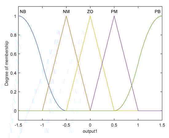In the equations, ‘Negative Big’ is denoted by NB, ‘Negative Medium’ by NM, ‘Zero’ by ZO, ‘Positive Medium’ by PM, and ‘Positive Big’ by PB. The membership functions for both the inputs and outputs are illustrated in Figure 6 and Figure 7.