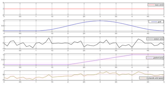 Furthermore, the step wind speed was set to transition from 6 m/s to 10 m/s at 1 s. To more accurately capture the stochastic and intermittent characteristics of wind energy, the spatiotemporal model of wind speed fluctuations typically delineated the composite wind into four distinct components: the base wind, gust, random wind, and gradient wind, as depicted in Figure 10, with an additional illustration provided in Figure 11 for clarity.