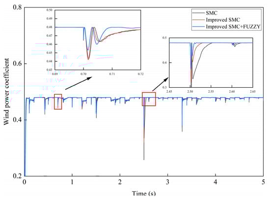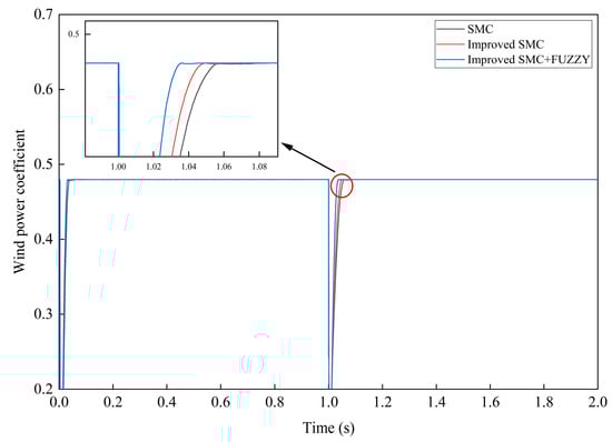 Figure 12 illustrates a comparison of the wind energy utilization coefficient under three control strategies. The improved FSMC strategy and the improved SMC strategy exhibited a faster response, compared to the traditional SMC strategy. Initially, the difference between the improved FSMC and the improved SMC was not significant, but over time, the improved FSMC adapted its parameters autonomously, resulting in a quicker response for the wind power system. At 1 s, when the wind speed stepped up to 10 m per second, the increase in rotational speed caused the wind energy utilization coefficient to deviate from its optimal state. The permanent magnet direct-drive wind power system automatically adjusted the blade pitch through pitch control and adjusted the rotor speed through variable speed control to bring the wind energy utilization coefficient back to its optimal state. Consequently, the wind energy utilization coefficient initially decreased and then stabilized at 1.035 s, whereas other strategies stabilized after 1.04 s, as shown in Figure 12. Therefore, the improved FSMC strategy demonstrated shorter response times and a faster stabilization efficiency.