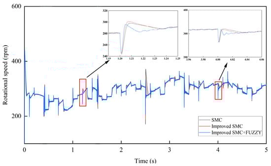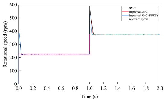To evaluate the efficacy of the proposed control strategy, comparisons were made between the improved FSMC approach and both the traditional SMC and other improved SMC strategies. The parameter design was as follows: Simulations were conducted in the MATLAB/Simulink environment using the control system configuration outlined in Figure 9, with motor parameters specified in Table 2 [26]. In the SMC, the parameters were designed to be , , and .
