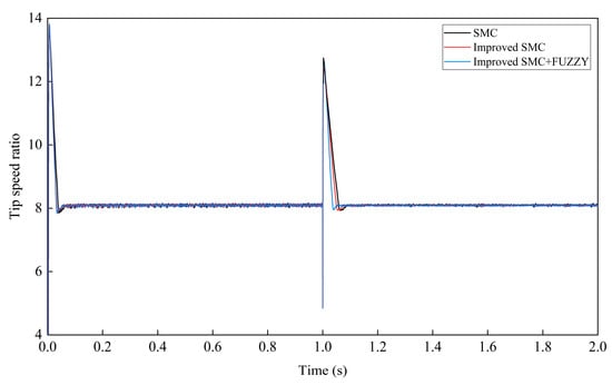 The system was subsequently tested under composite wind speed conditions. Figure 17, Figure 18 and Figure 19 present comparative waveforms of generator rotational speed, wind energy utilization coefficient, and TSR, respectively, under traditional SMC, improved SMC, and improved FSMC strategies.