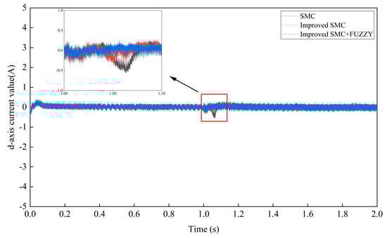 Initially, the system was validated under step-change wind speed conditions. Figure 12, Figure 13 and Figure 14 present comparative diagrams of the wind energy utilization coefficient, generator rotational speed tracking, and TSR, respectively, under traditional SMC, improved SMC, and improved FSMC strategies. The relationship between d-axis and q-axis currents under the three control strategies is depicted in Figure 15 and Figure 16.