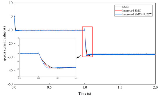 Figure 16 indicates that the overshoot of the current was relatively small for all three control strategies. However, the improved FSMC strategy exhibited a shorter response time to reach a stable state upon wind speed change at 1 s. Additionally, Figure 15 shows that the fluctuations of the d-axis current were significantly less at 1 s, compared to the other strategies. Therefore, the improved FSMC strategy was considered more stable.