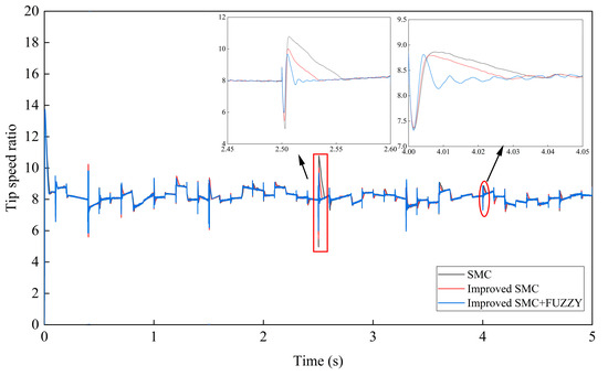 In Figure 19, the TSR under the improved FSMC strategy quickly entered a narrow range close to the optimal value. The TSR was maintained close to the set optimal value of 8.1. As can be seen from the local magnified plots, it reduced the overshoot and improved the response speed, compared to the other two methods, thus providing the best power output efficiency and system stability. Therefore, it can be observed that regardless of step change or composite wind speeds, the improved FSMC strategy performed well and was significantly superior to the other two control strategies.
