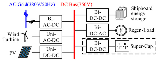 Nowadays, the transportation sector has been a major source of greenhouse gas and carbon emission globally [1]. Taking the docked ships in the harbor for example, the shipboard power supply mostly relies on the diesel generator which consumes more fuel and produces more carbon emission than in the state of navigation [2]. This makes the shore-to-ship power technology, deploying the shore-based power, especially the renewables, to supply the docked ships, highly attractive to decarbonize shipping transportation [3,4]. Therefore, there is a high demand for a renewable and efficient shore power system that can integrate the public grid, photovoltaics (PV), wind turbines, shipboard energy storage, and loads in a single system, as illustrated in Figure 1. In such a system, the shore-based energy storage, such as a super-capacitor, also plays a key role in buffering the power fluctuation of the renewables and recycling the power from the regenerative loads [5]. Compared to the AC counterpart, the DC shore power system eliminates the additional DC–AC and AC–DC power conversion stages that are unnecessary for the DC-internal sources and loads, which reduces the investment cost and improves the system efficiency [6].