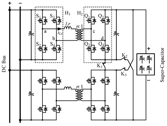 The CM-2L-DAB converter consists of two 2L-DAB modules as shown in Figure 2. Each 2L-DAB module is composed of two H-bridges with 8 switches and diodes, one high-frequency (HF) transformer with a leakage inductance Lk and a turn ratio n, and two DC-link capacitors. The inputs of two modules are connected in parallel to interface the DC bus of the shore power system. The outputs of two modules are connected to the super-capacitor in a flexible manner via three relays, K1, K2, and K3. When K1 is closed and K2 and K3 are open, the two modules are in an IPOS configuration, which makes it suitable to withstand the high voltage of the super-capacitor. When K1 is open and K2 and K3 are closed, the converter is reconfigured to IPOP, which can share the high current stress in the low-voltage operation.