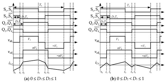 The operation waveform of the EPS is shown in Figure 3. All switches operate with a 50% duty cycle over a switching period Ts. When V1 > nV2, the phase shift between S1 and S4 define the inner phase shift ratio D1 ∈ [0, 0.5], and the phase shift between S1 and Q1 define the outer phase shift ratio D2 ∈ [0, 0.5]. Depending on the relationship of D1 and D2, two modulation modes are derived for the EPS, where D1 ≤ D2 as shown in Figure 3a accounts for the heavy-load mode, and D2 < D1 as shown in Figure 3b accounts for the light-load mode.