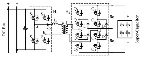 In the DC shore power system, the bidirectional isolated DC–DC converter is a key enabling component to interconnect the super-capacitor and the shipboard battery storage system to the DC bus. Among others, the dual-active bridge (DAB) converter and CLLC resonant converter stand out as the most popular topologies due to their bidirectional power transfer capability and soft-switching characteristic [7,8,9,10]. Compared to the CLLC, the DAB converter requires less passive components and has a wider voltage range and higher power rating [11,12,13]. Thus, the DAB converter is preferred in the super-capacitor charging application. However, the wide voltage range of a high-power super-capacitor imposes high-voltage stress on the semiconductor devices, which makes the conventional two-level DAB topology inappropriate.