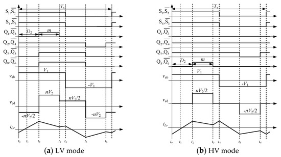 The operation waveform of the LV mode is shown in Figure 5a, where the primary side AC voltage vab is a 50% square wave and the secondary side AC voltage vcd is an asymmetric 4-level square wave. In this mode, one DoF of the modulation is the interval of the voltage level ±V2 equaling mTs, respectively, where m ∈ [0, 0.5]. Moreover, the outer phase shift ratio D2 ∈ [−0.5, 0.5] is also employed as the other DoF to control the direction and magnitude of the power flow.
