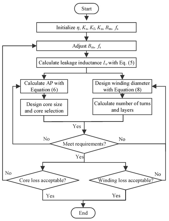 Based on the above analysis, the transformer design flowchart is depicted in Figure 6. Following the design flow, the transformer parameters for the two types of converters are listed in Table 3.