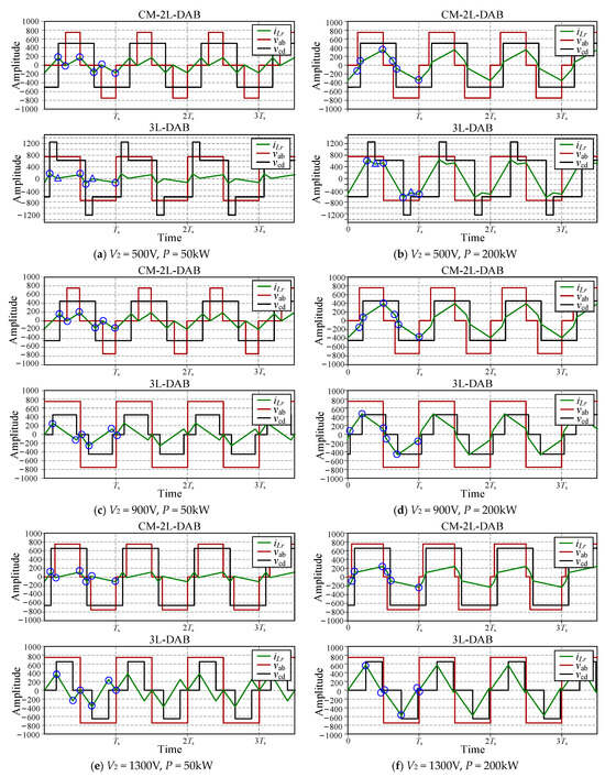 The EPS modulation of the CM-2L-DAB and the hybrid modulation of the 3L-DAB are validated via PLECS circuit simulation at the six operation points. The operation waveforms are shown in Figure 7. It is validated in Figure 7a that the CM-2L-DAB operates in the IPOP configuration and the EPS modulation with D2 < D1, while the 3L-DAB operates in the HV mode with 4 voltage levels. In Figure 7b, the CM-2L-DAB operates in the same LV mode but using other EPS modulation with D1 < D2, while the outer phase shift ratio D2 of the 3L-DAB increases with the load. In Figure 7c,d, when V2 increases to 900V, the CM-2L-DAB operates in the IPOS configuration and the EPS modulation, while the 3L-DAB operates in the HV mode with only two voltage levels. In Figure 7e,f, when V2 further increases to 1300 V, the CM-2L-DAB remains in the IPOS configuration, but the inner phase shift ratio D1 decreases, while the 3L-DAB remains in the HV mode but with a smaller m. The operation waveforms validate the effectiveness of the modulation strategies for both topologies.