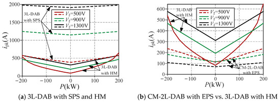 The transformer peak current of the 3L-DAB with the SPS modulation and the proposed hybrid modulation (HM) is firstly compared in Figure 8a. It is evident that the proposed hybrid modulation significantly reduces the current stress of the 3L-DAB at all voltage and load levels. A further comparison is made between the peak current of the CM-2L-DAB with the EPS and the 3L-DAB with the hybrid modulation in Figure 8b. It should be noted that peak current of the CM-2L-DAB represents only one DAB module. It is clear that the CM-2L-DAB has a lower transformer peak current than the 3L-DAB at most of the operation points.