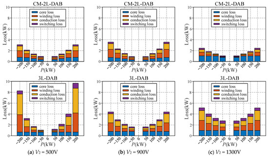 The power losses of two topologies are evaluated and compared using the loss models derived in Section 4. A bidirectional load range of [−200 kW, 200 kW] is scanned for three output voltage levels {500 V, 900 V, 1300 V}. The power loss breakdown is shown in Figure 9. Compared to the 3L-DAB, the CM-2L-DAB has a lower total power loss in nearly all conditions. The largest difference is shown under the low-voltage condition of V2 = 500 V, where the IPOP configuration halves the device current stress of the CM-2L-DAB leading to a significantly lower device conduction loss and transformer winding loss. For the 3L-DAB, the high current at the low output voltage flows through the 3L-NPC bridge where switches are connected in series, leading to even higher conduction loss. In the low-to-medium-voltage condition, the conduction loss and winding loss are dominated at the heavy load for both topologies. It should also be noticed that the power loss of the CM-2L-DAB is symmetrically distributed under bidirectional load conditions, but for the 3L-DAB the power loss of the forward transmission is higher than the reverse mode under the low-voltage condition. This is due to the fact that the voltage waveforms and transferred power of the LV mode for the 3L-DAB are asymmetric regarding the bidirectional power.